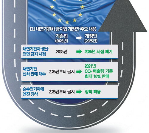 유럽연합(EU)이 2035년 내연기관차 판매 전면 금지 방침을 완화하며 친환경 자동차 시장의 새로운 변곡점이 찾아왔다. EU 집행위는 최근, 일부 내연기관 차량의 신규 등록을 2035년 이후에도 허용하겠다는 정책 기조를 공식화했다. 특별 기준을 충족하는 합성 연료(e-fuel) 차량에 한해서이나, 이는 사실상 순수 전동화 정책의 명확한 후퇴 신호로 해석된다. 독일, 이탈리아 등을 중심으로 한 유럽 완성차 업계의 로비가 영향을 미친 결과로, 기존 내연기관차 생산 설비와 고용 문제, 외연 성장 둔화, 소비자 수요 불확실성 등이 정책 변동의 배경이다.